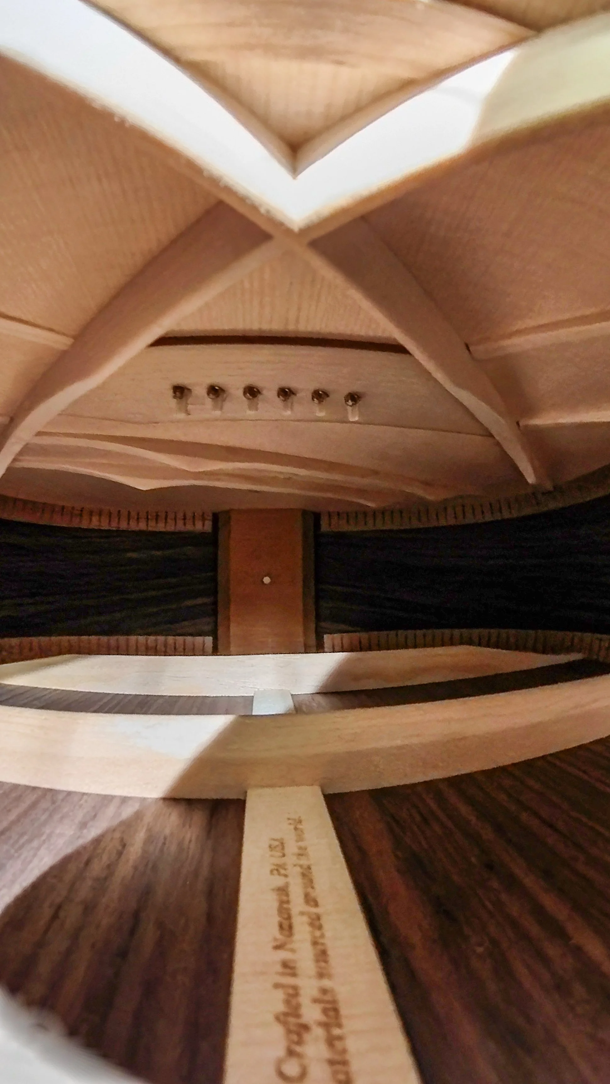 Interior view of the inside of a wooden musical instrument, likely a guitar, showing the wooden bracing and inner structure.